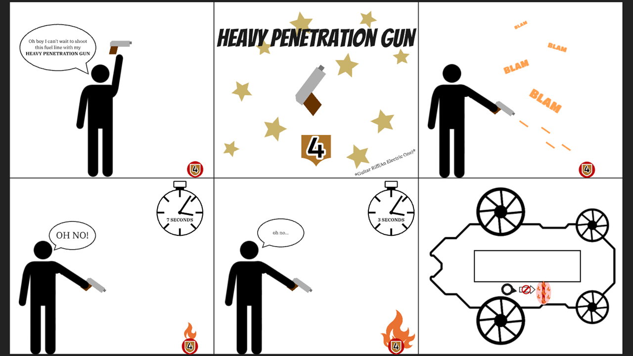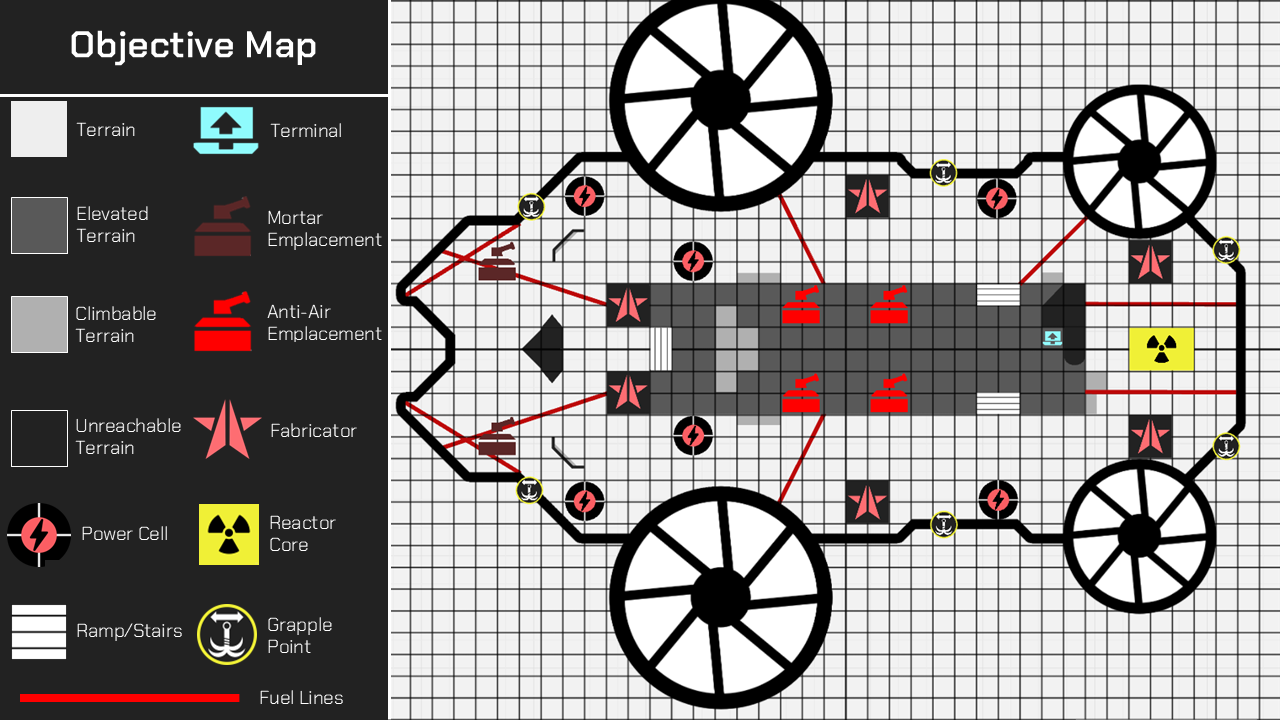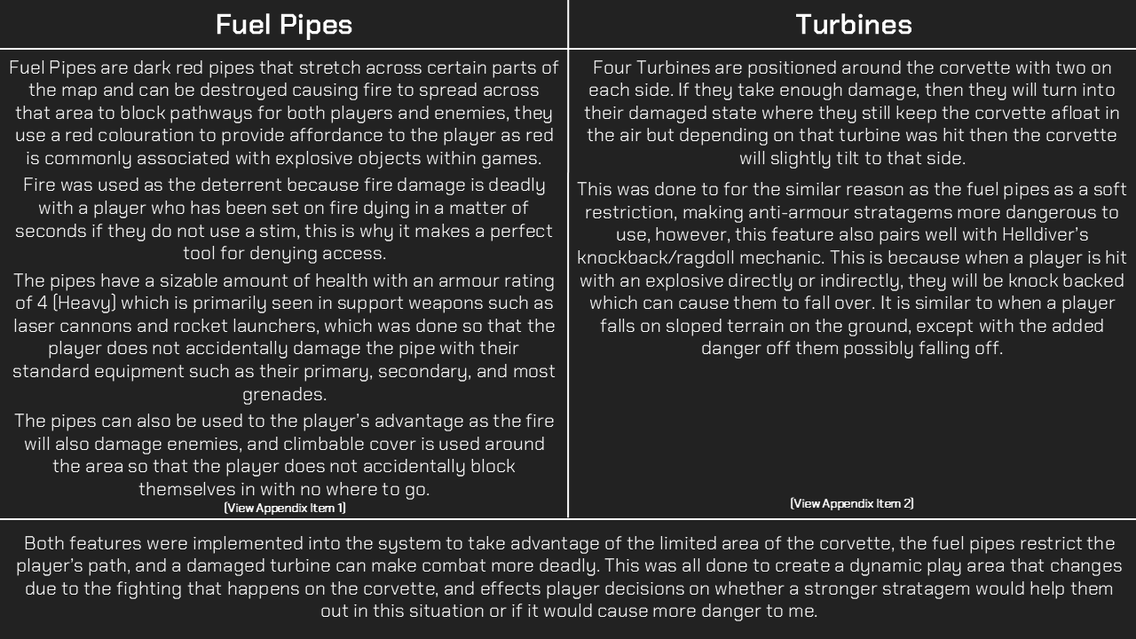 Iterating on my concept I landed on the idea of two hazards: the fuel lines and the turbines. The fuel lines were bright red (which often connotes an explosive object) hoses that stretch across areas of the corvette which if enough damage is delt at a high enough armour penetration would cause it to explode and create an area of denial for player with massive flames that wouldn’t go out. It is worth noting that the environment offers climbable terrain which means that the flames only remove one pathway and do not completely block the player.