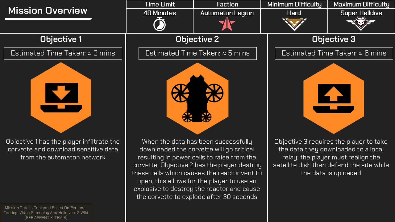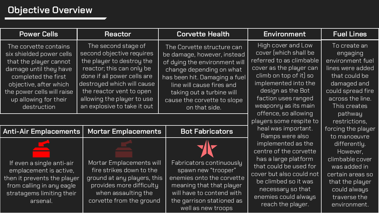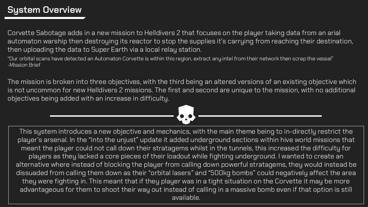 This Slide Deck introduced a new mission into Helldivers 2 which also came with new mechanics such as a new stratagem, objective and hazards.