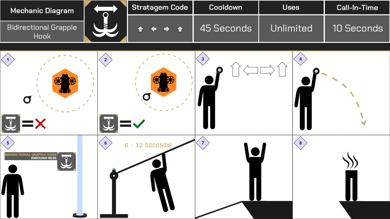 To help with this, the player is also given a new “objective critical stratagem” which only appears in this mission. This new stratagem is the “Bidirectional Grapple Hook” which can be called down when the player is near the objective, when called the hook will plant into the ground and shoot a tether onto the nearest grapple point so that the player has a way to reach the corvette from the ground.