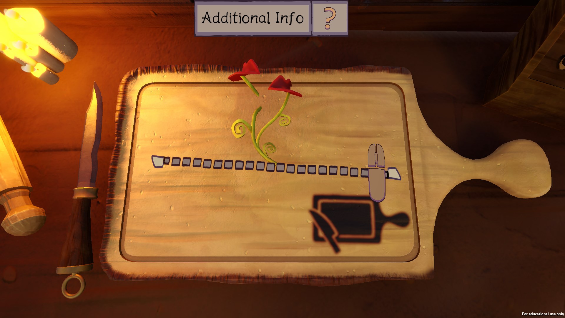 When the chopping board minigame is started the player is given one of the minigame variations where dashed lines hover above the ingredient the player has placed in. The player must drag their mouse across the dashed lines to complete a cut, once all the cuts are complete then a new variation appears. The player must complete three round of this for the ingredient to be prepped and ready to be placed in the cauldron.