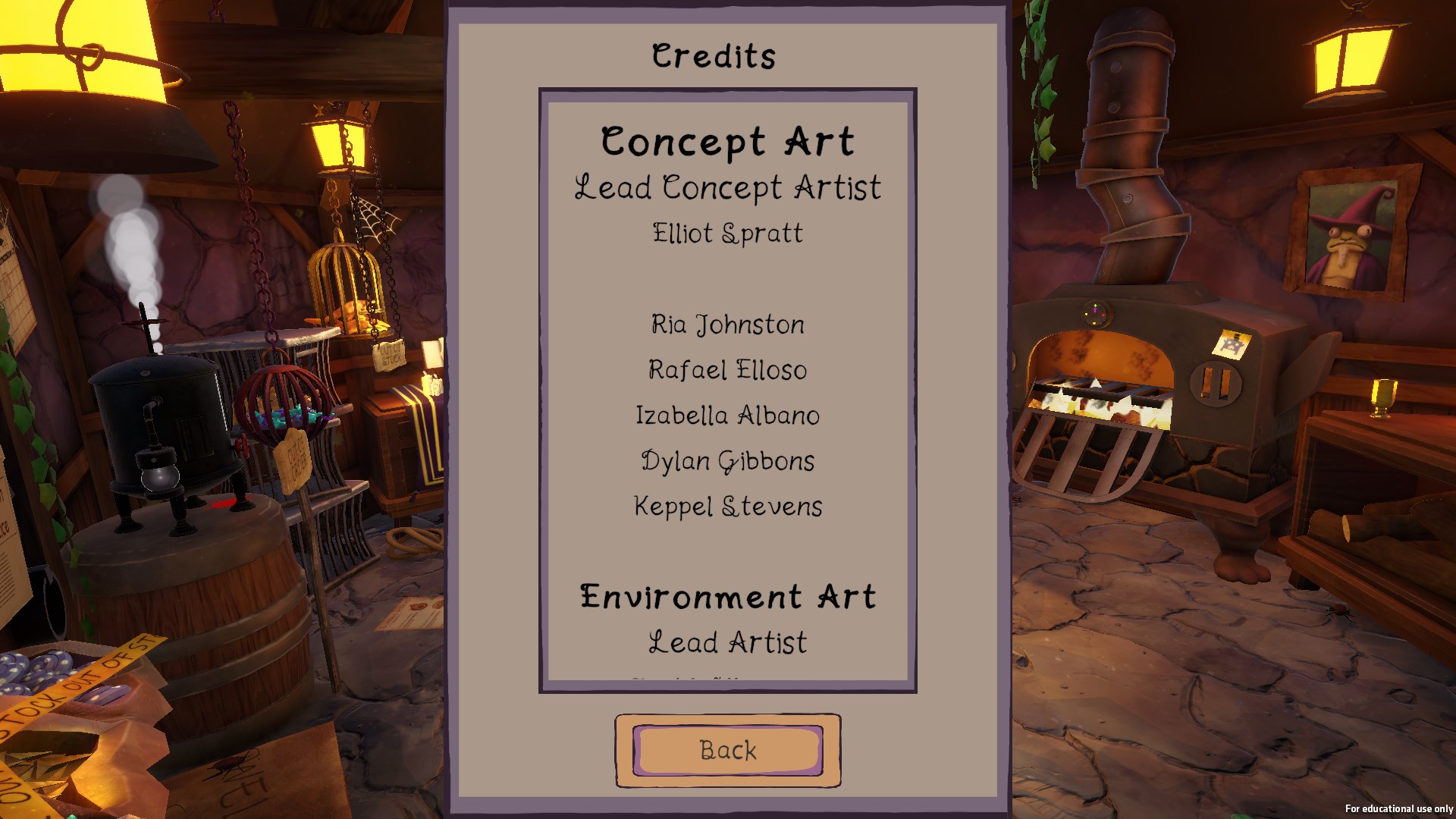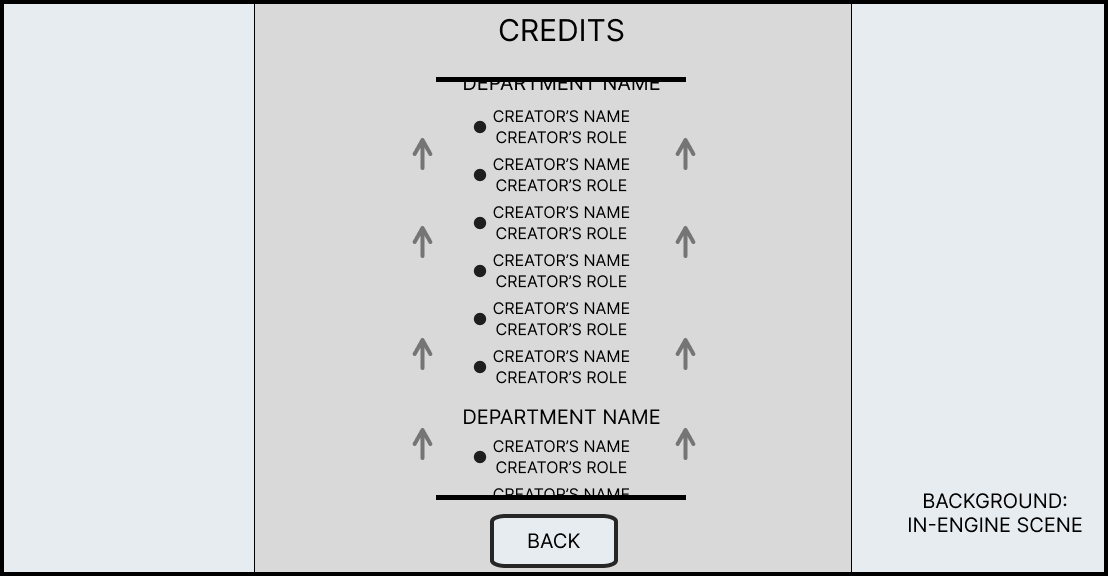 In the end after multiple versions were shared to the team, we ended up chooses an option that was inspired by a traditional credits list you would find in any contemporary game where a list of names is scrolled past the screen. This allowed for people to be properly credited for the work that they did instead of giving them a credit that was very generalist and did not accurately represent the work they contributed.