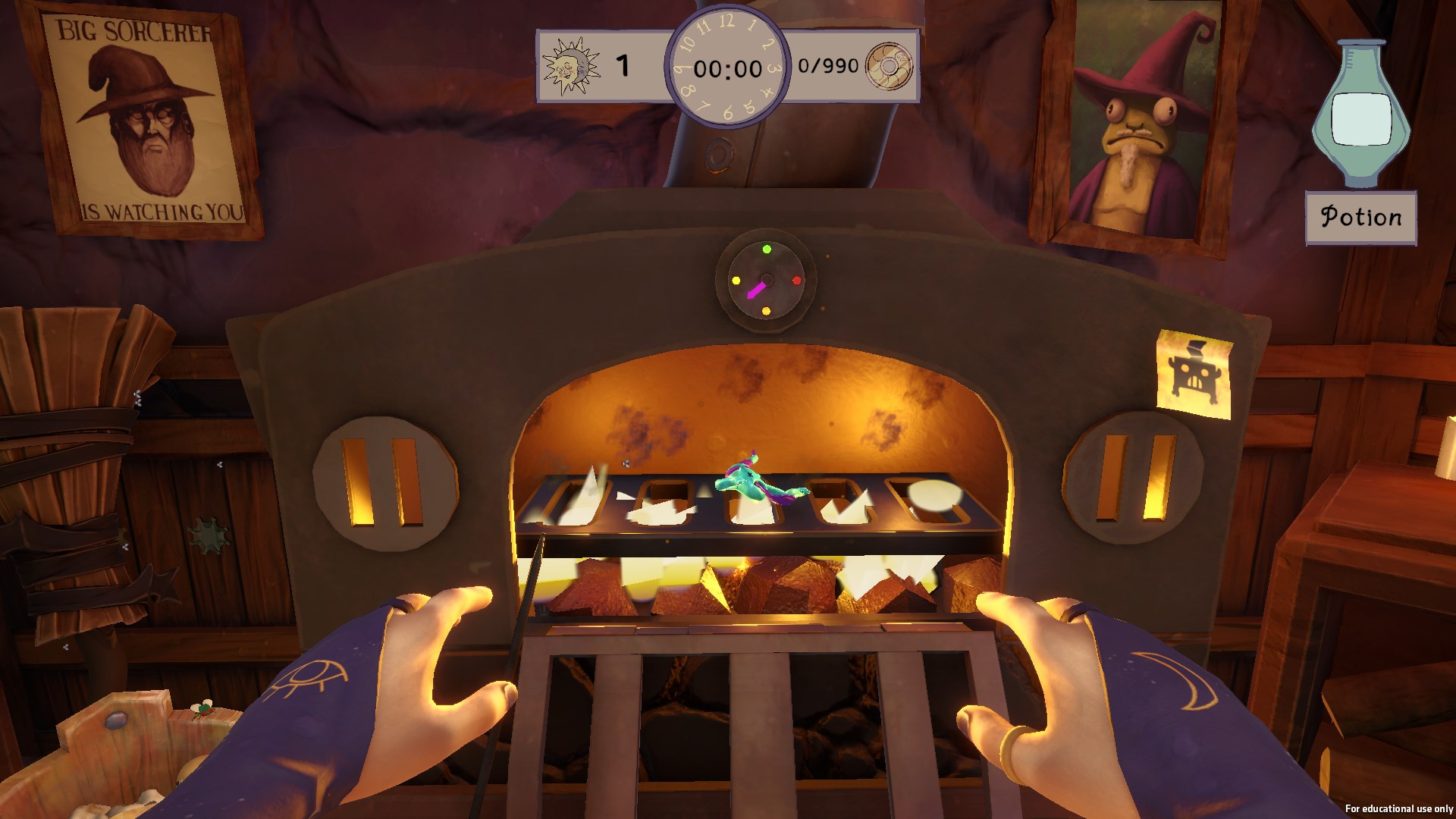 The furnace is a passive minigame in the sense that the player isn’t locked in when its activated. The player will first place an ingredient into the furnace which will start the timer above the opening. The player is free to move around and do other activities when an ingredient is cooking. However, they will need to keep an eye on it because if the ingredient stays in the furnace over the time limit, then the ingredient will burn and become unusable in the potion recipe.