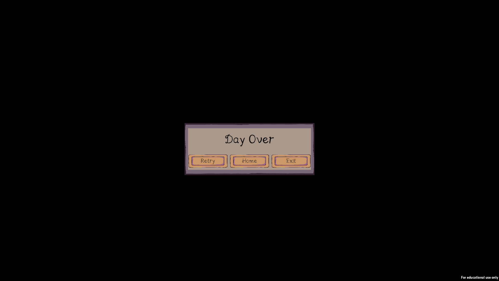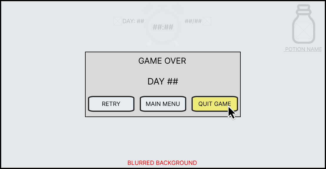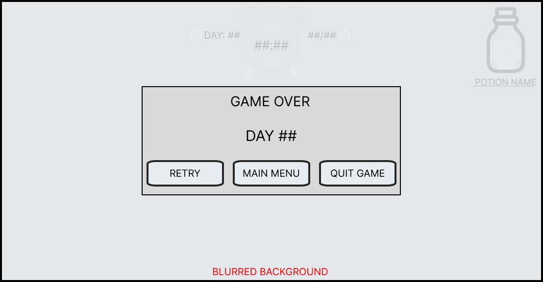 If the player fails to reach their daily quota by the end of the time limit, then they will trigger a game over. When this happens, the screen will blur and the game over panel will appear in the centre of the screen with the current day they are on.