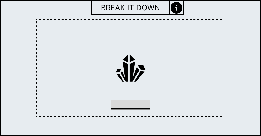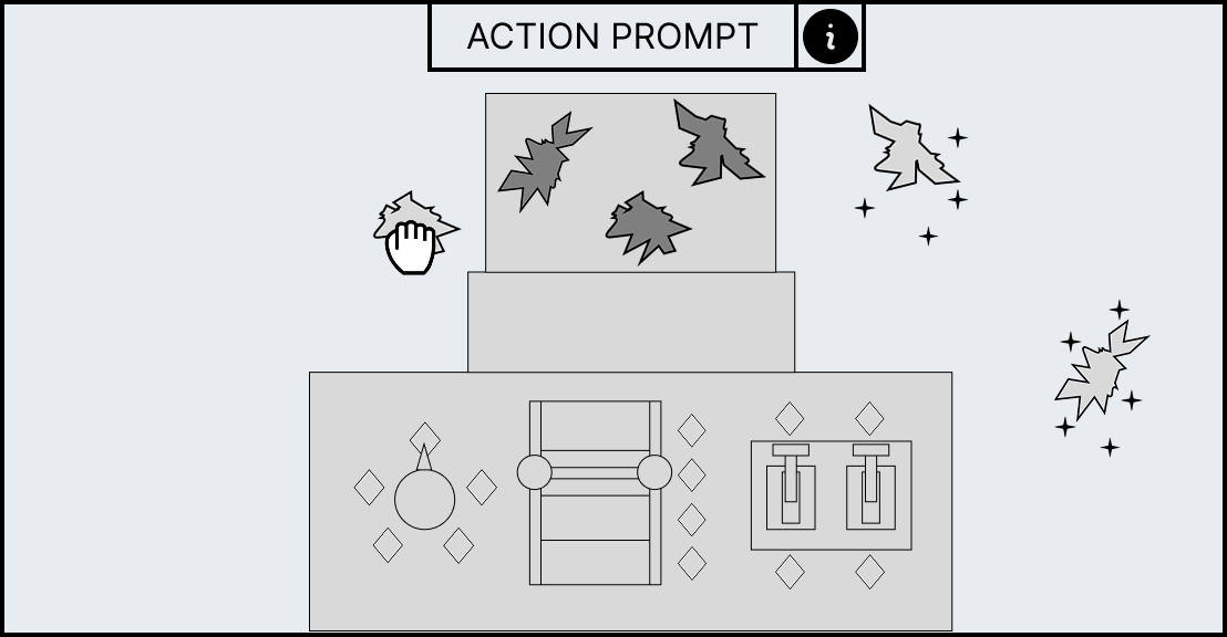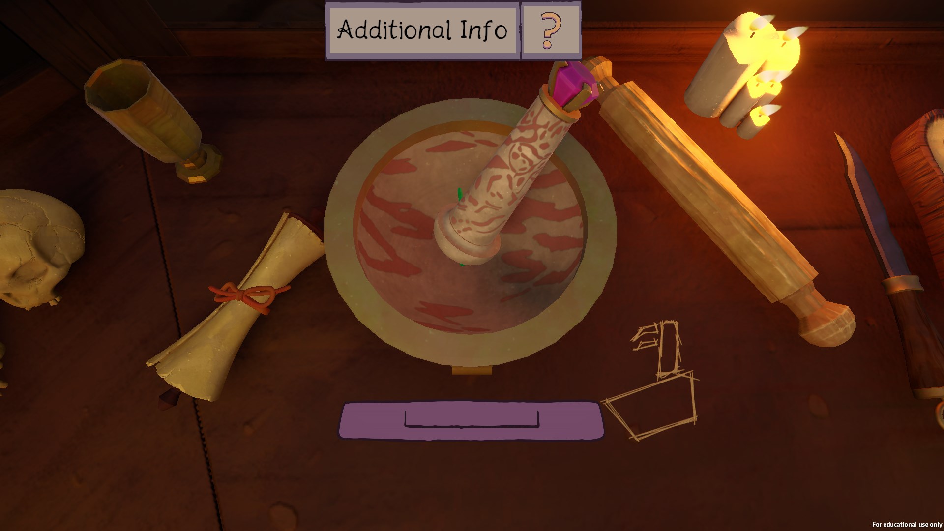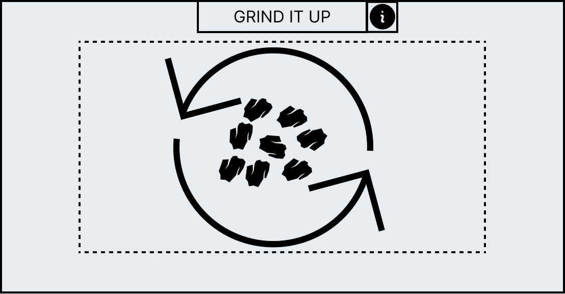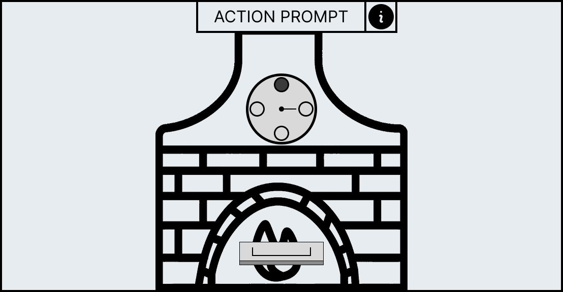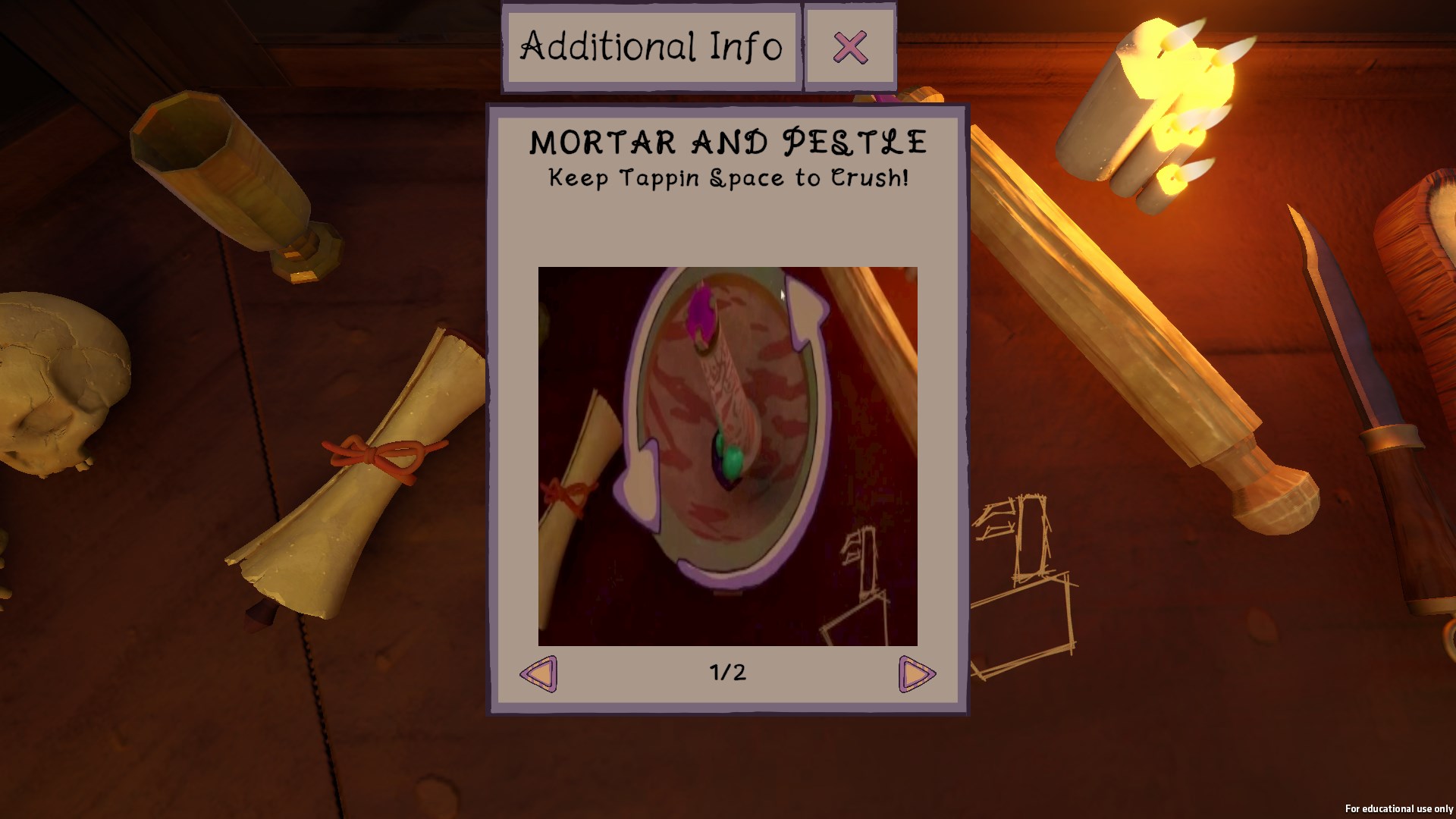 Each minigame has unique UI elements depending on the workstation as each workstation requires different actions to complete its minigame. However, all minigames share a HUD which contains information to help guide the player. At the top of the HUD an action prompt will be displayed which will summarise what the player has to do in the current stage, for example, the mortar and pestle minigame has the action prompt called “break it down” to convey to the player that they have to smash the ingredient. However, if this is not sufficient enough an information panel can be brought up with the “info” icon that allows the player so see the entire minigame broken down into stages with the action prompt as a title as well as a short description and video which will explain what the player has to do.