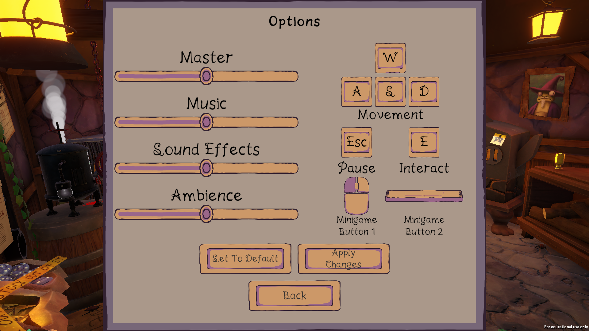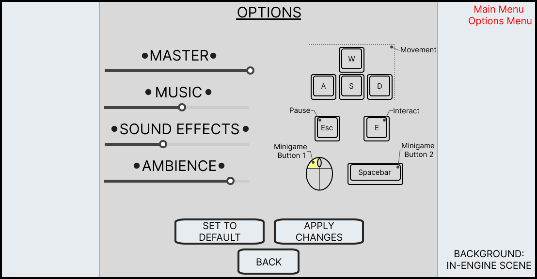Originally the options menu would have been subdivided into four submenus; those being Game, Video, Audio and Controls. Controls was the first to go since as the project progressed we realised that the player would need less inputs than expected, so we replaced the Keybind options with a control map that displayed all the keys needed and what they did.
