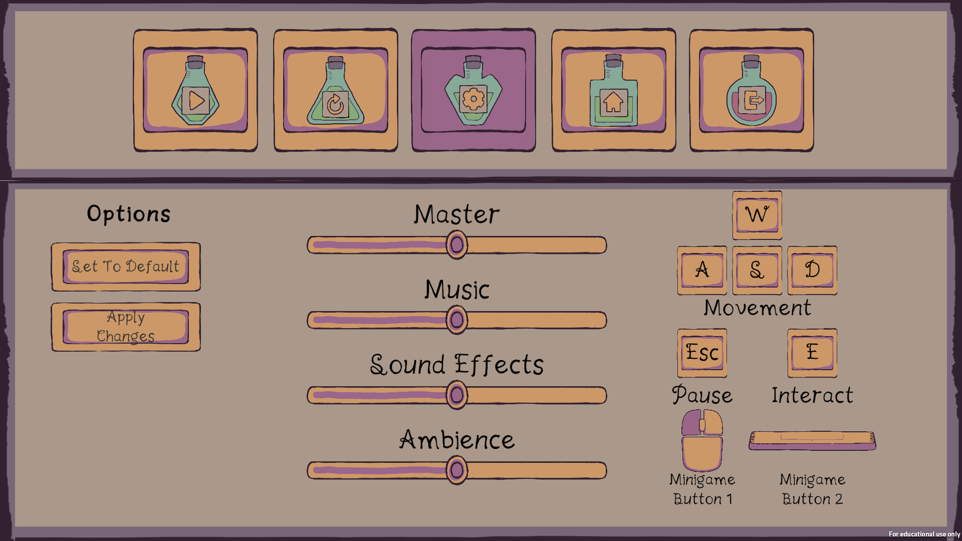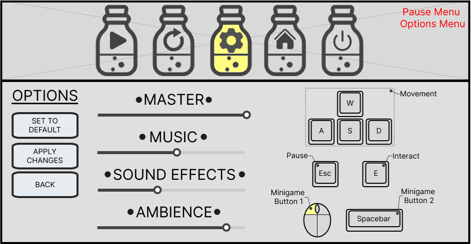 In the end the options menu was reduced to audio settings and a control map as our project at this time had many ongoing issues with the core gameplay that took priority over other features.