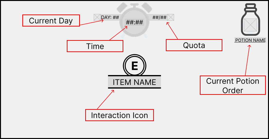 At the top of the HUD contains three elements. The left bar is the current day that the player is on, the centre widget is a clock which counts down how long the player has until the day is up. The right widget is both how much money they have earned this day and what their daily quota is, these two were combined so that the player could easily see how much more money they need to earn to meet their quota.